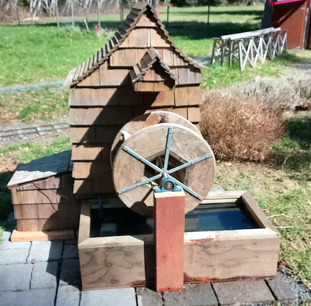 Not known during the discussion was that Russ had already built the replacement box, so the plastic tote idea is irrelevant. Rocks can still hide the box. But the wood that held the waterwheel is rotted, so new wood is needed there. But to get at that, the whole thing might fall apart.