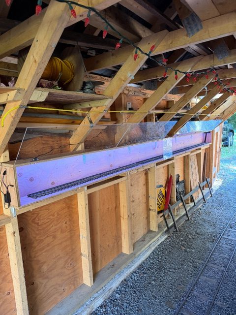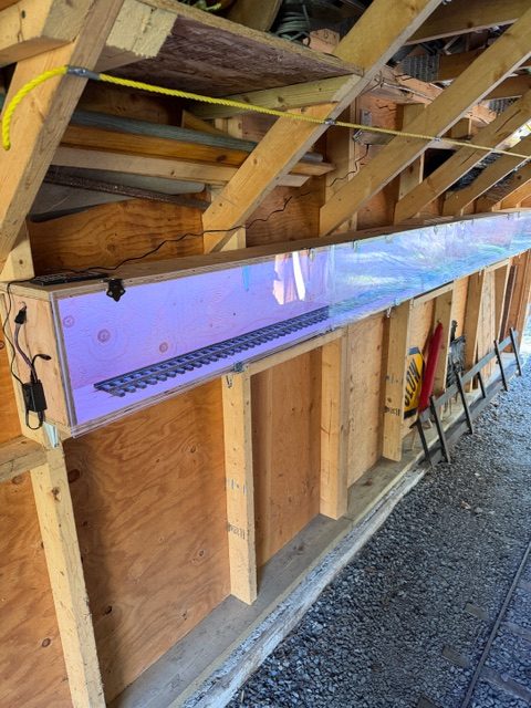 Jan 17: Russ obtained donated plexiglas and built the west shed summer display/storage system. 16′ x 7″ x 10″.